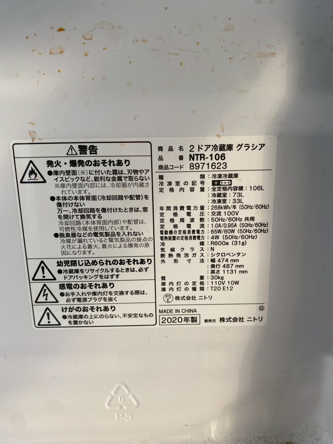 今回は埼玉県上尾市にお住まいの40代男性・会社員・単身・賃貸(アパート)のお客様より、ニトリ 2ドア冷蔵庫 グラシア NTR-106(2020年製)を不用品買取にてご依頼いただきました。