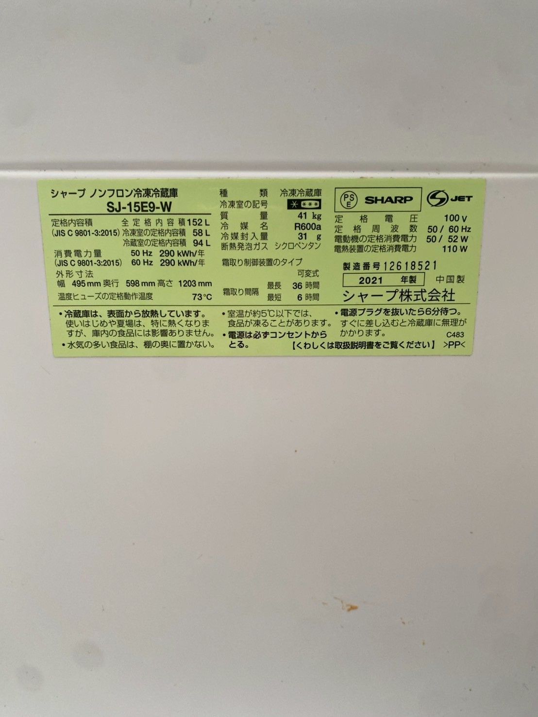埼玉県朝霞市にてシャープ製ノンフロン冷凍冷蔵庫SJ-15E9-W使用状態を考慮して買取・査定しました