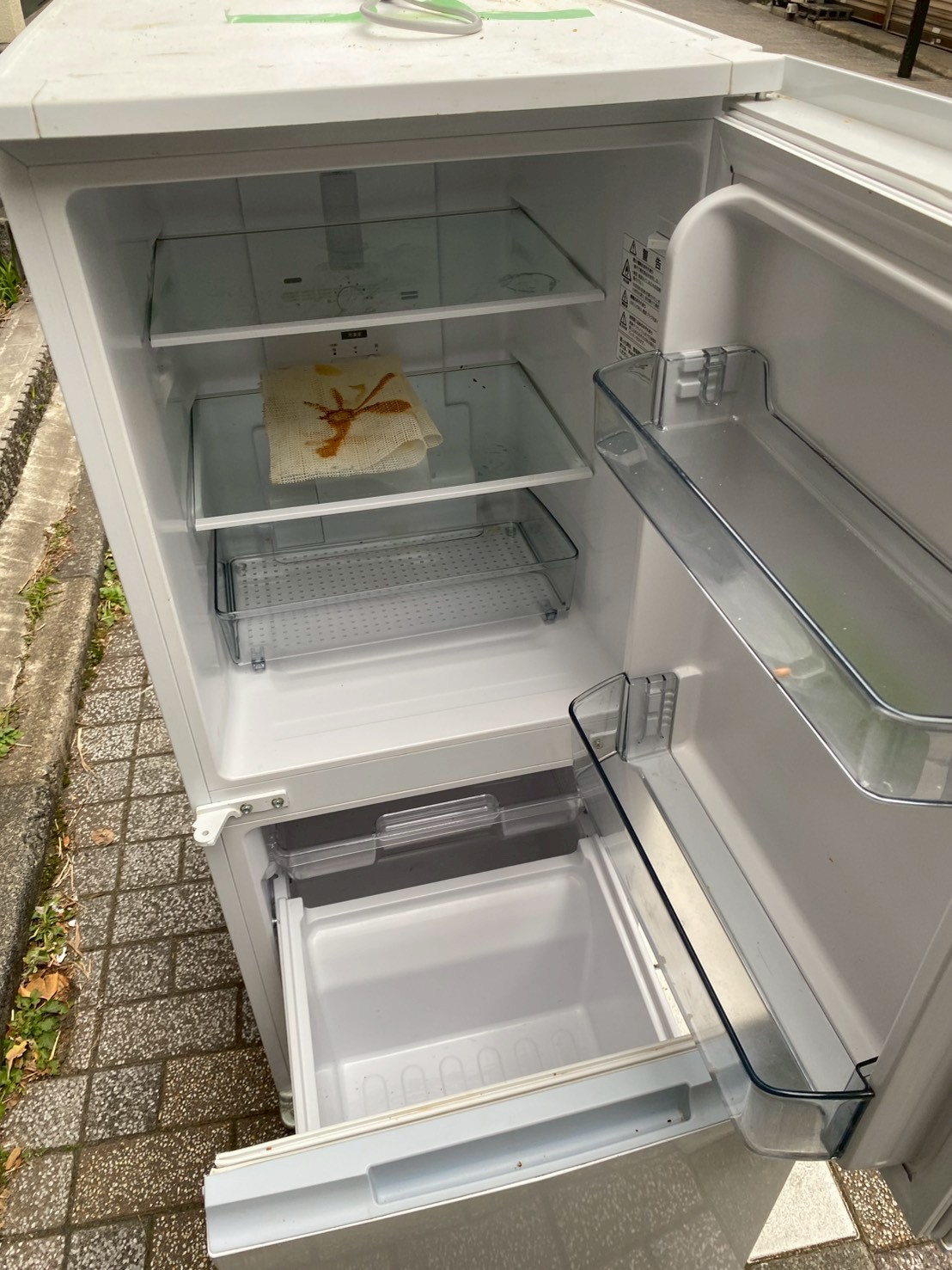 お引き取りした商品は、外観に使用に伴う軽度の汚れや小さなスレが見られる状態でした。庫内については棚・ドアポケット・野菜ケースが揃っており、冷蔵室・冷凍室ともに大きな割れや破損は確認されませんでした。一部、棚の上に汚れが残っていましたが、冷却動作や庫内灯の点灯など基本機能は正常であることを確認しています。