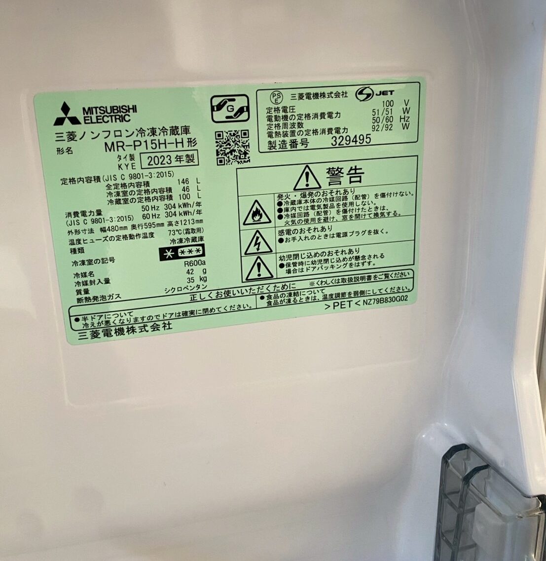 今回は埼玉県さいたま市にお住まいの40代女性主婦のお客様より、三菱電機製三菱ノンフロン冷凍冷蔵庫MR-P15H-H(2023年製)の買取をご依頼いただきました。