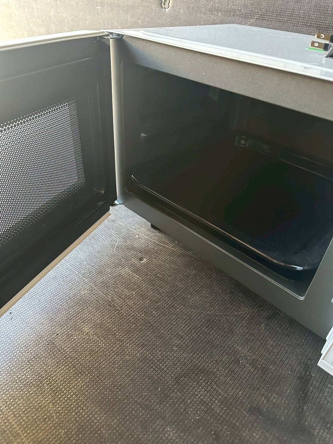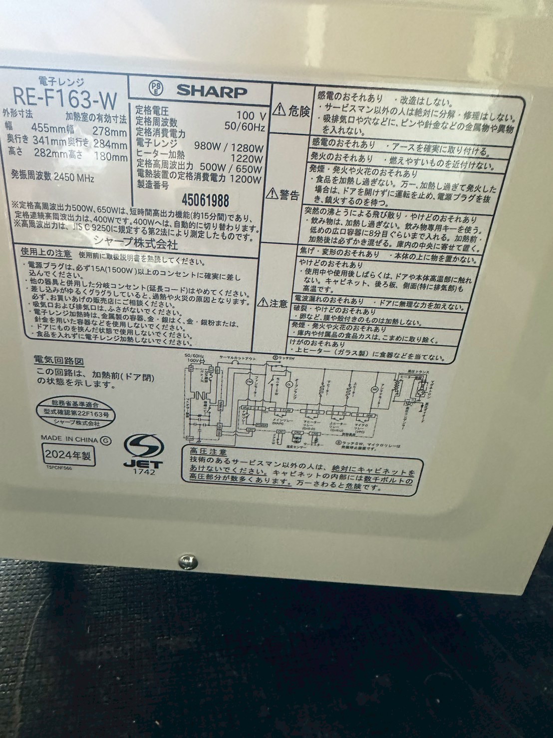 お預かりしたRE-F163-Wは2024年製と比較的新しいモデルで、外装は目立つ傷やへこみもなく、全体的にきれいな状態でした。庫内も確認しましたが、焦げ付きや強い臭い残りは見られず、ターンテーブルや内壁も良好なコンディションを保っていました。電源コードも純正品が付属しており、動作確認でも問題なく加熱できることを確認しております。
