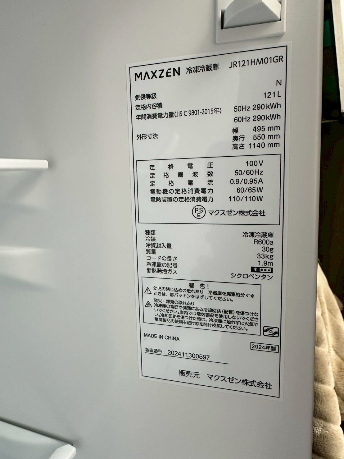 今回はさいたま市にお住まいの30代女性・会社員(単身・賃貸マンション)のお客様より、MAXZEN 冷凍冷蔵庫 JR121HM01GR(2024年製)の不用品買取をご依頼いただきました。
