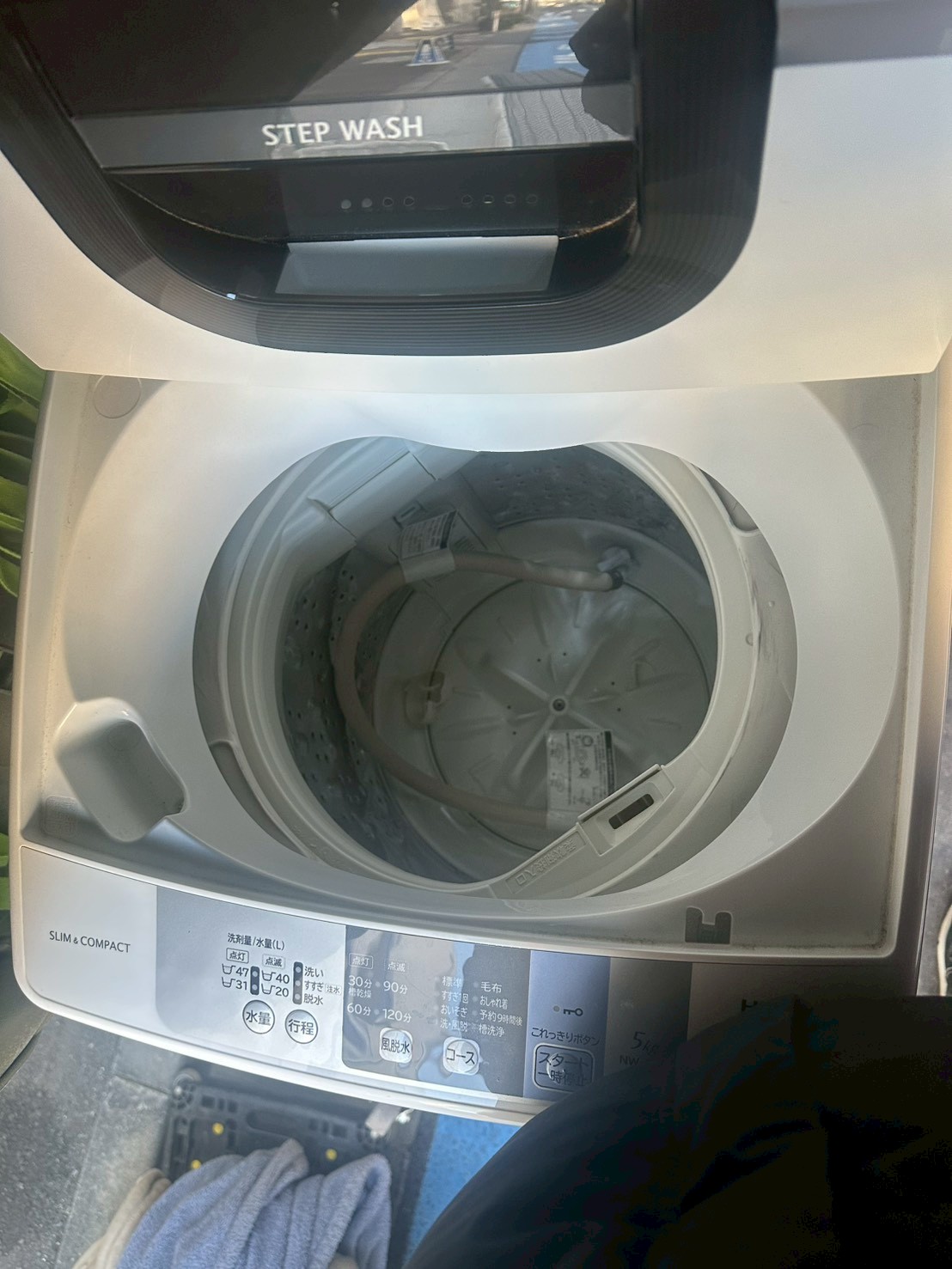 お品物は2018年製の5.0kgモデルで、外観には細かな擦れや設置跡が見受けられましたが、大きなへこみや割れはありません。洗濯槽内部も比較的きれいな状態で、動作確認を行ったところ給水・排水・脱水ともに問題なく稼働しました。排水ホース・給水ホースも揃っており、通常使用に支障のないコンディションでした。