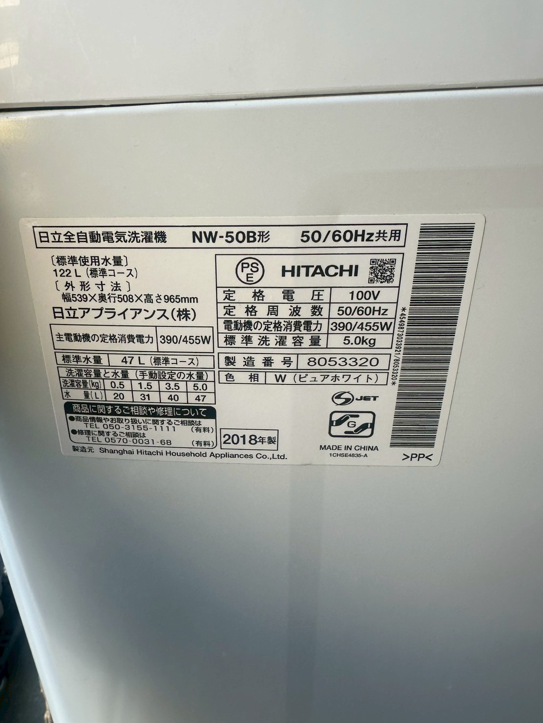 埼玉県三郷市へ不用品買取 日立 NW-50B(2018年製)全自動洗濯機 使用感ありのため適正価格で査定しました