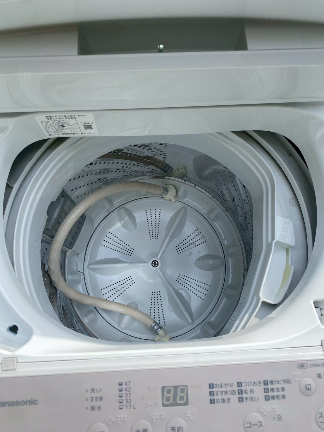本体外装は目立つキズやヘコミがなく、全体的にきれいな状態でした。洗濯槽内部も清潔感があり、強い汚れや臭いの付着は見られません。操作パネルの表示や各ボタンの反応も良好で、給排水ホースも揃っており動作面も問題のないコンディションでした。