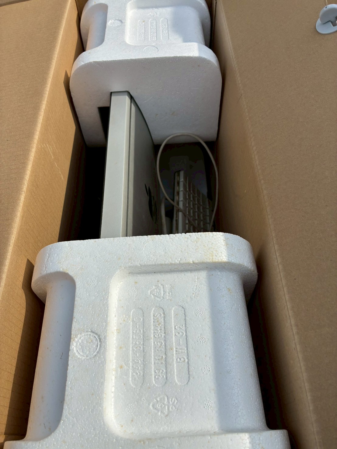お預かりした製品は純正外箱に収められた保管状態の良いお品でした。箱には保管時の汚れやテープ跡が見られますが、本体を保護する発泡材や付属品が揃っており、保管状態の良さがうかがえます。付属のキーボード・マウスも確認でき、再販に適したコンディションと判断しました。