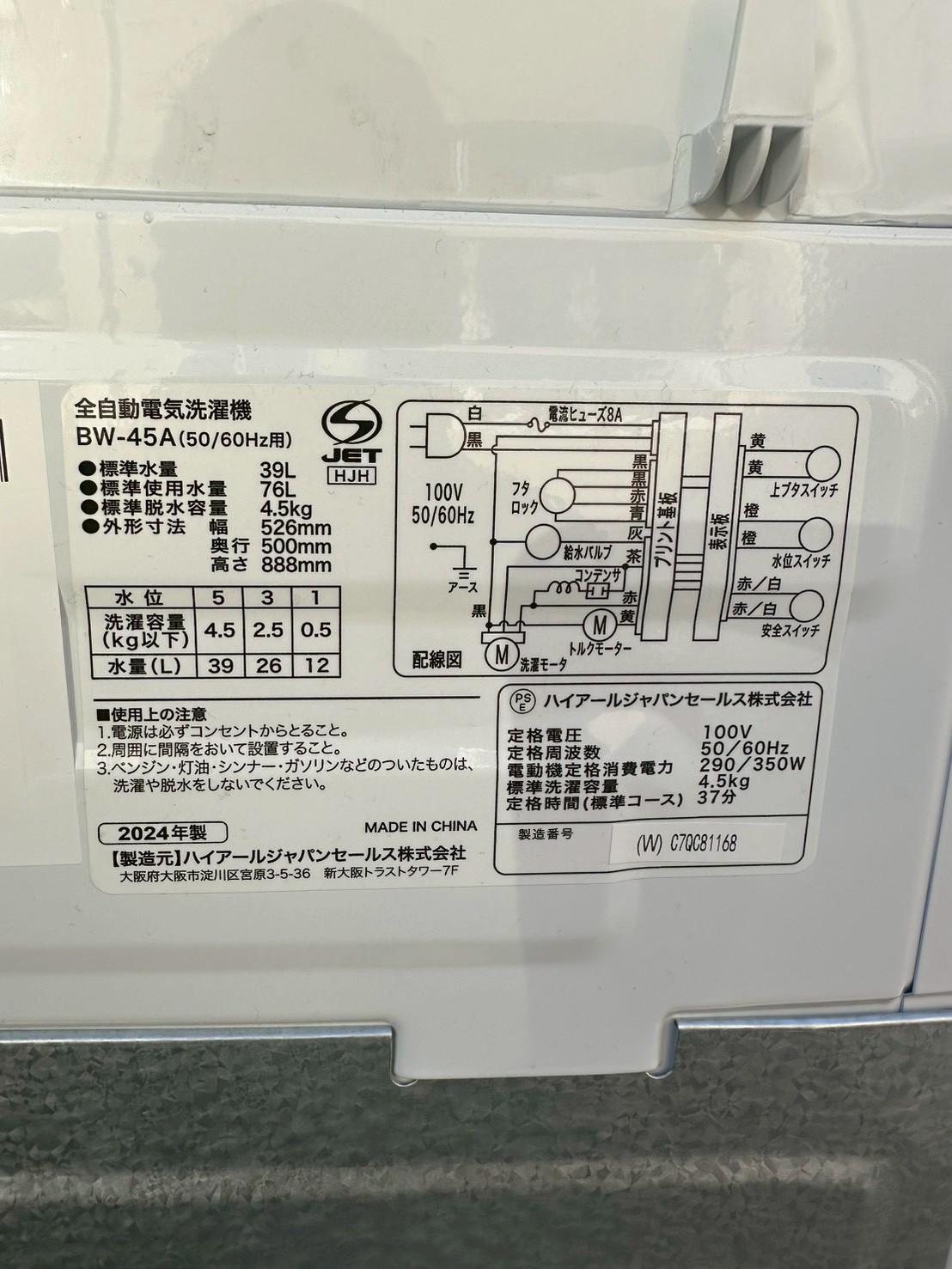 埼玉県上尾市でハイアール 全自動洗濯機 BW-45A(2024年製)を不用品買取 美品のため高価査定しました