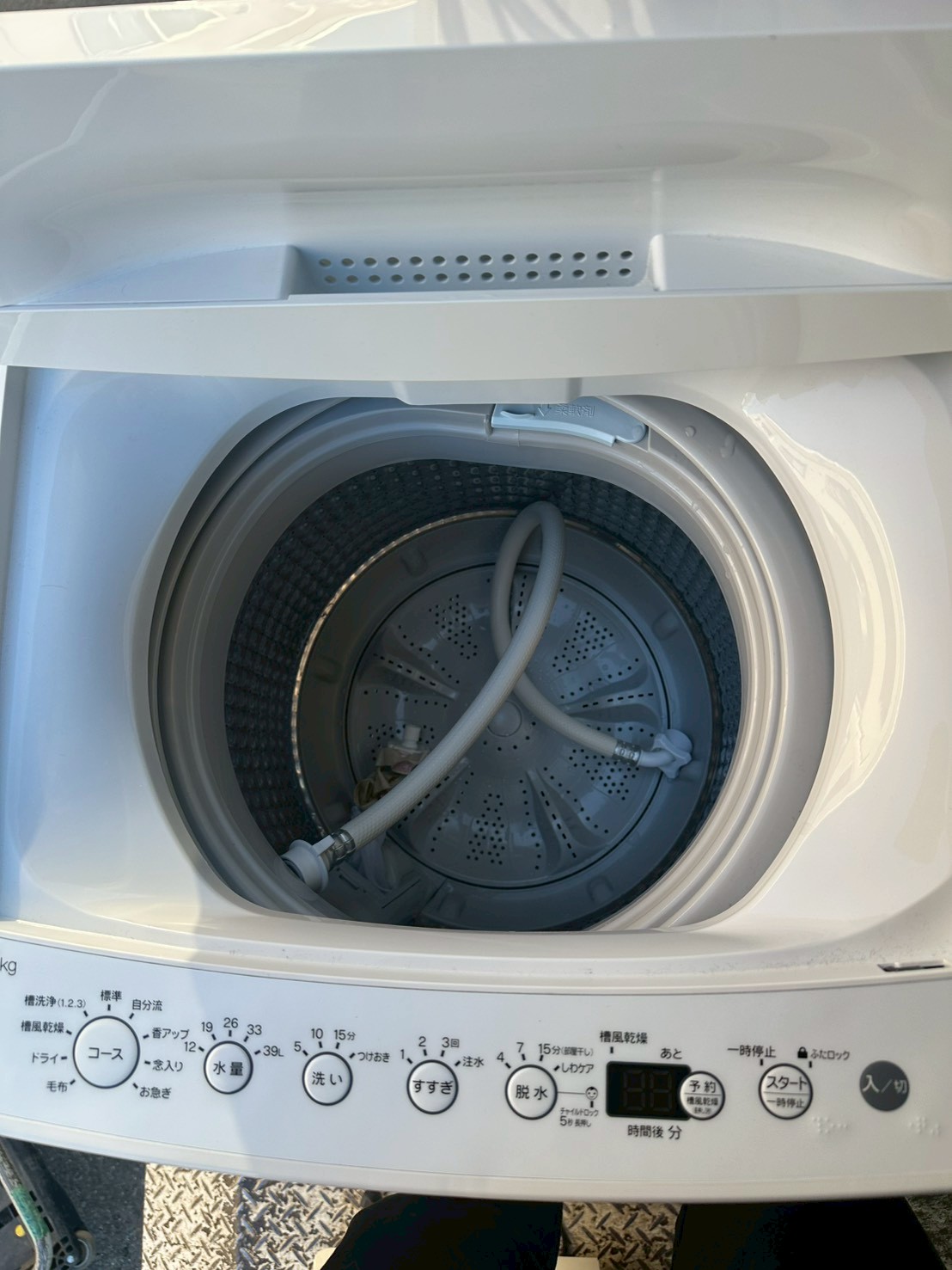 本体外装は目立つ傷やへこみがなく、使用感の少ない非常にきれいな状態でした。洗濯槽内部も汚れやカビの付着が見られず清潔感があり、動作確認でも給水・洗い・脱水ともに問題なく作動しました。給水ホースなどの付属品も揃っており、すぐに使用できるコンディションでした。