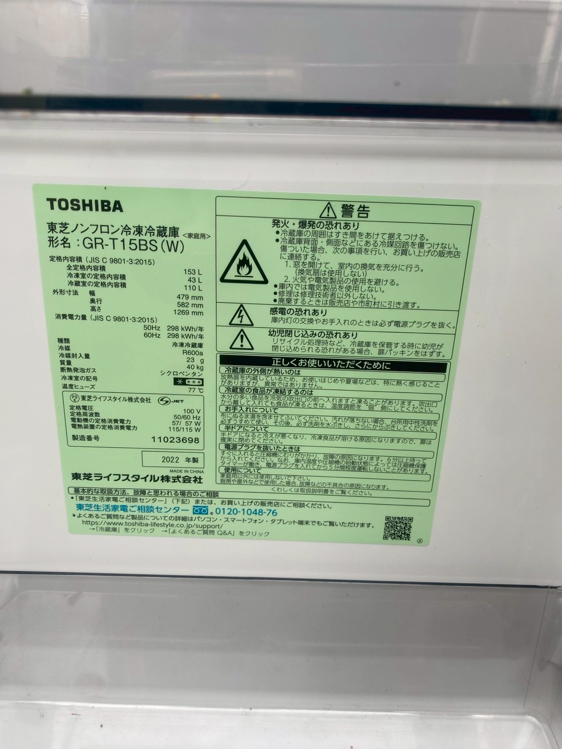 今回はさいたま市にお住まいの40代男性・会社員(単身世帯)より、TOSHIBA ノンフロン冷凍冷蔵庫 GR-T15BS(W)(2022年製)の不用品買取をご依頼いただきました。