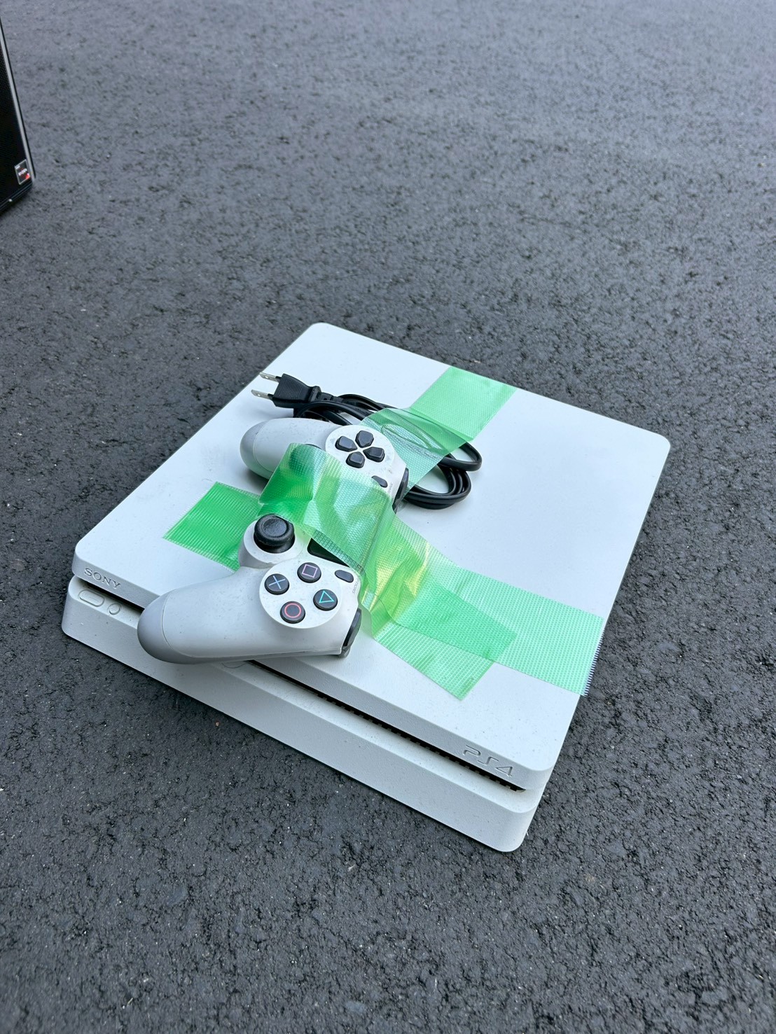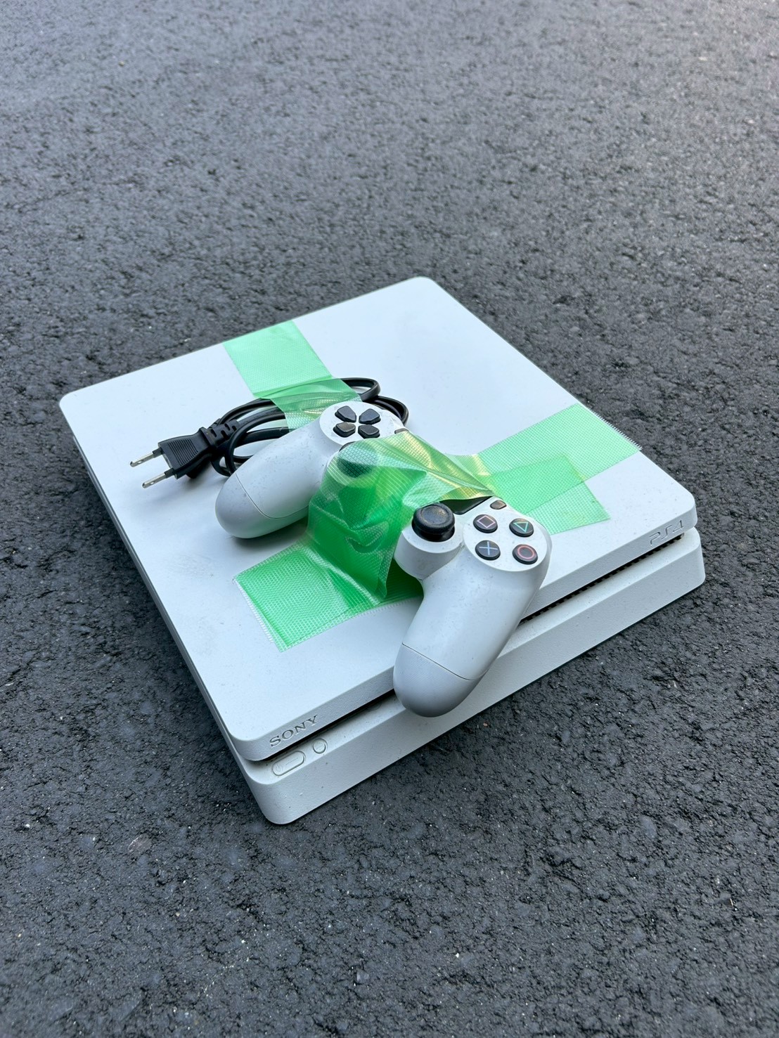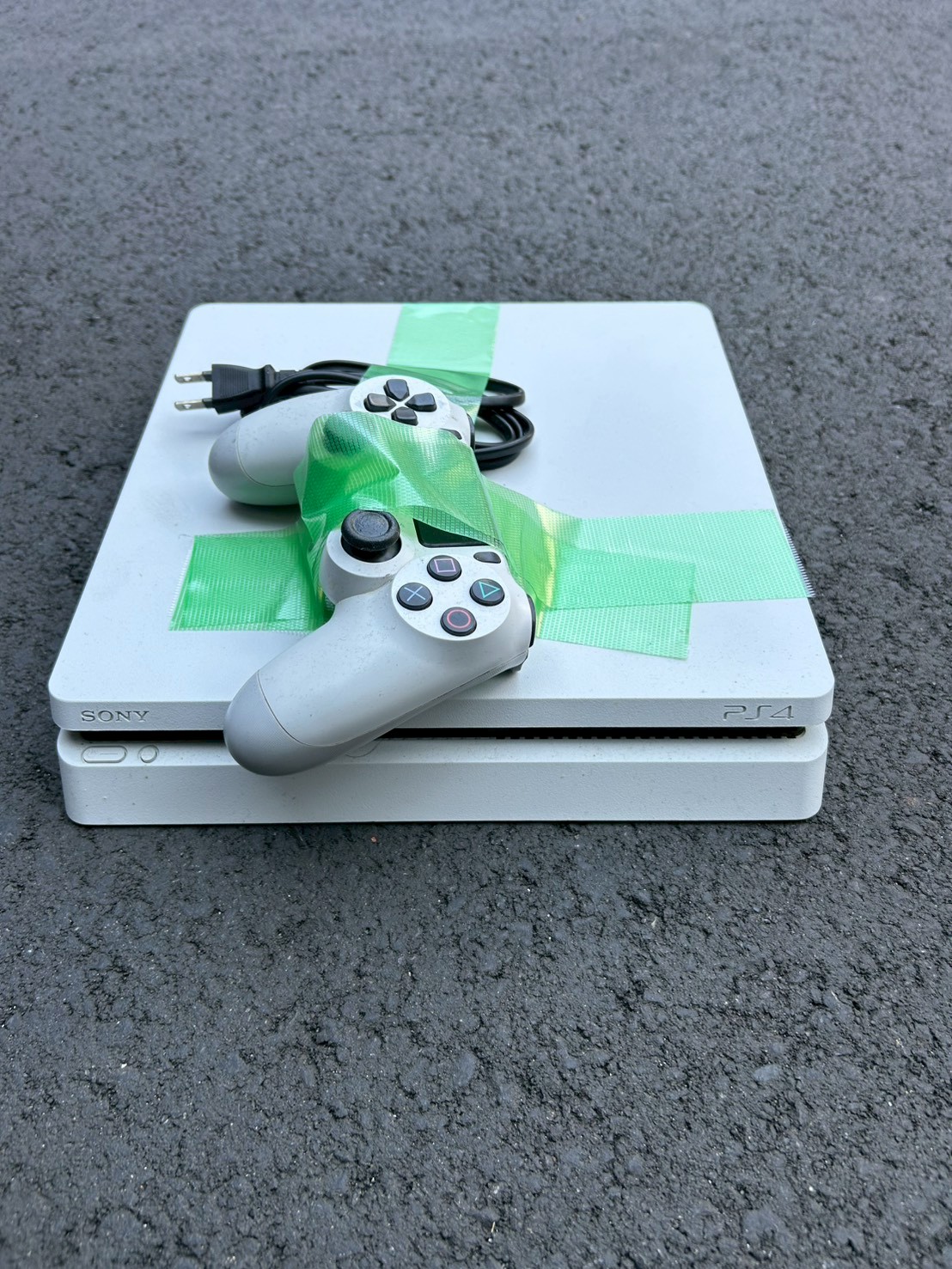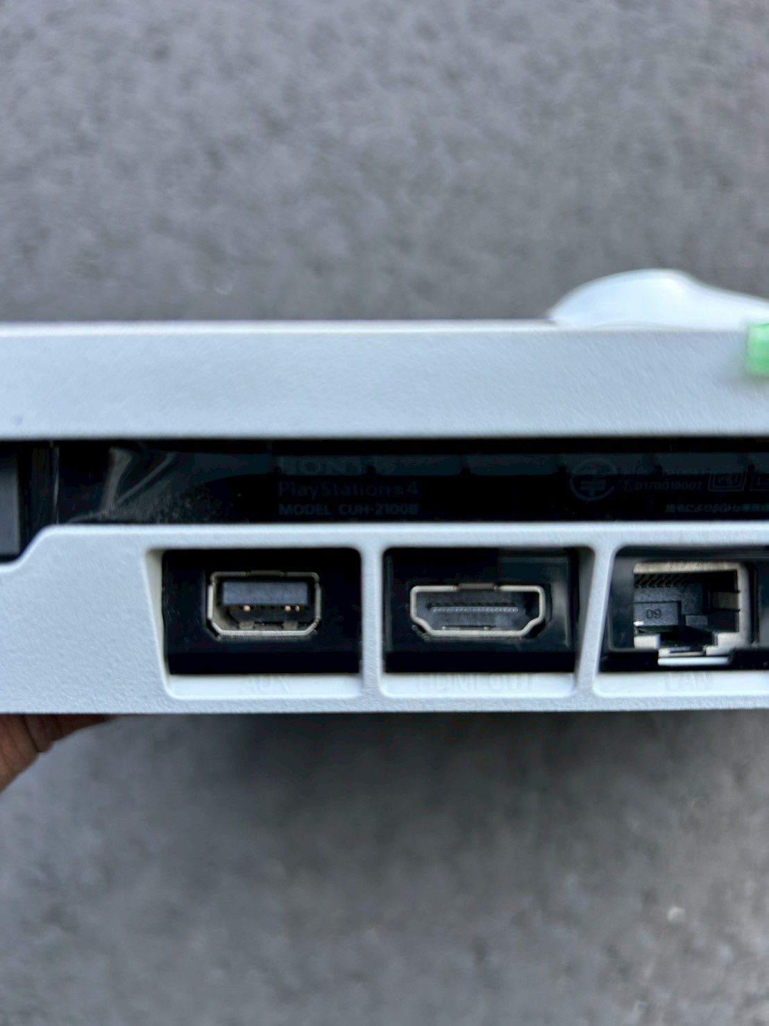 お持ち込みいただいたPS4はCUH-2100B(1TBモデル)で、本体カラーはホワイトです。外観には若干の細かな擦り傷や使用感が見られましたが、大きな割れや欠損はありませんでした。付属品として純正コントローラー2台と電源ケーブルが揃っており、HDMI出力・LANポートの接続確認も実施。起動・ディスク読み込み・各ボタン操作ともに問題なく動作することを確認しました。コントローラーはスティック部分に軽度の使用感があるものの、操作不良は見られませんでした。
