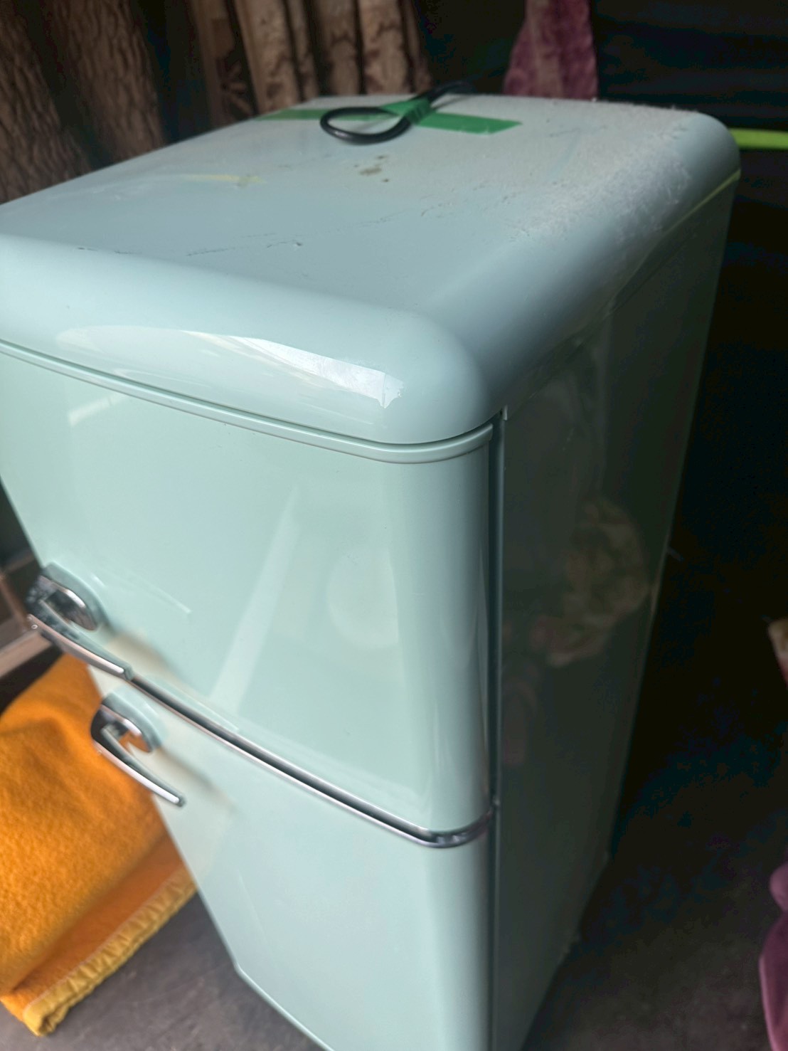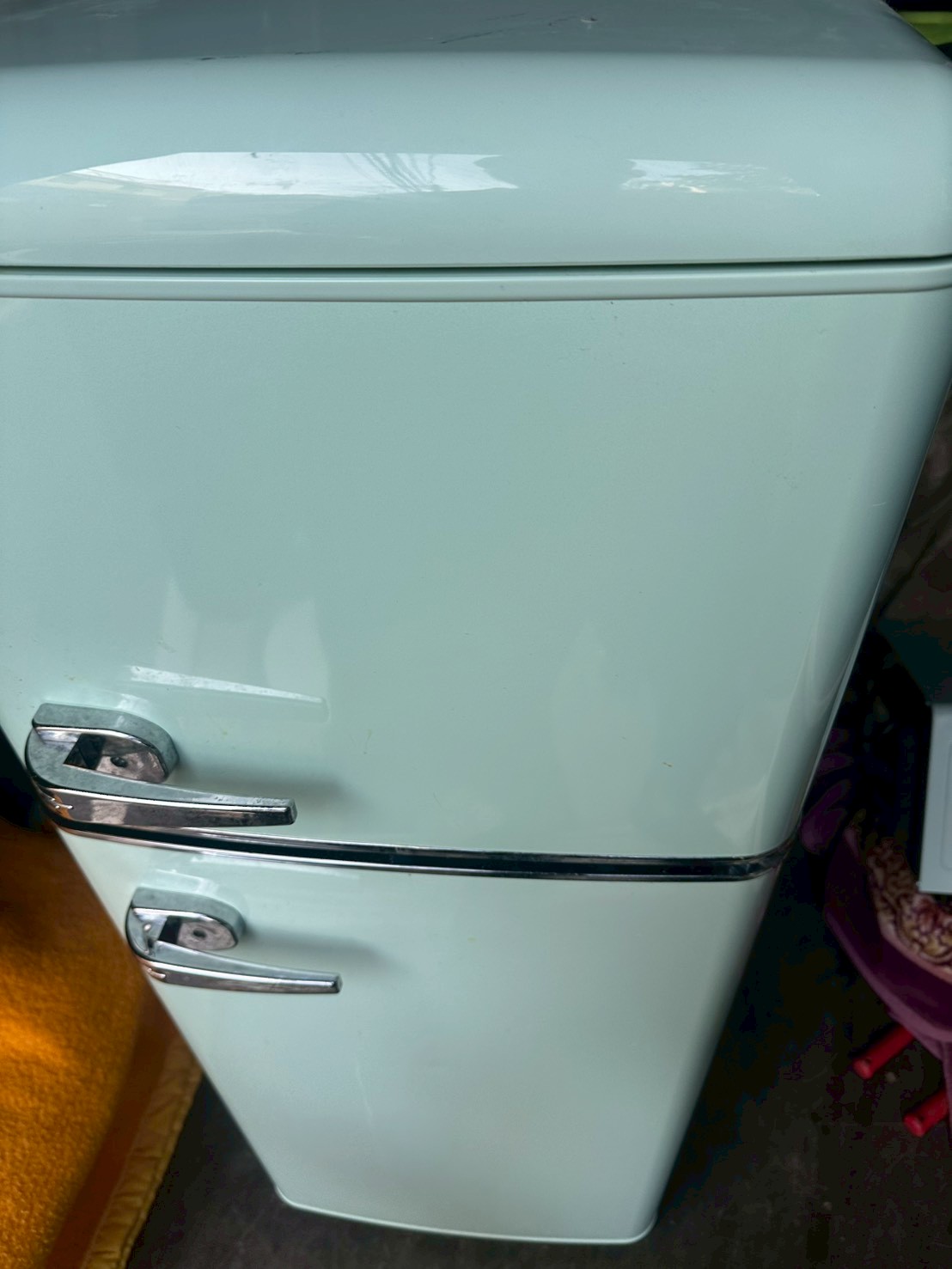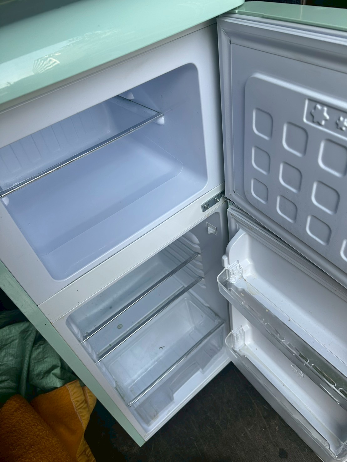 お引き取りしたPRR-122D-LGは、淡いグリーンのレトロデザインが特徴的な2ドア冷蔵庫です。外観には大きなへこみや目立つ塗装剥がれはなく、全体的に艶も残っている状態でした。天板部分に軽微な使用感は見受けられましたが、再販に影響するレベルではありません。