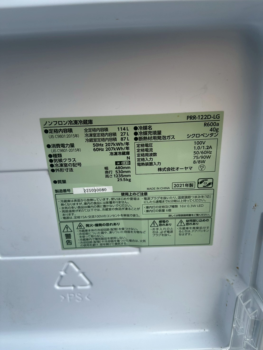 今回はふじみ野市にお住まいの40代女性(自営業・親子世帯・持ち家(一戸建て))より、オーヤマ ノンフロン冷凍冷蔵庫 PRR-122D-LG(2021年製・114L)を不用品買取にてご依頼いただきました。