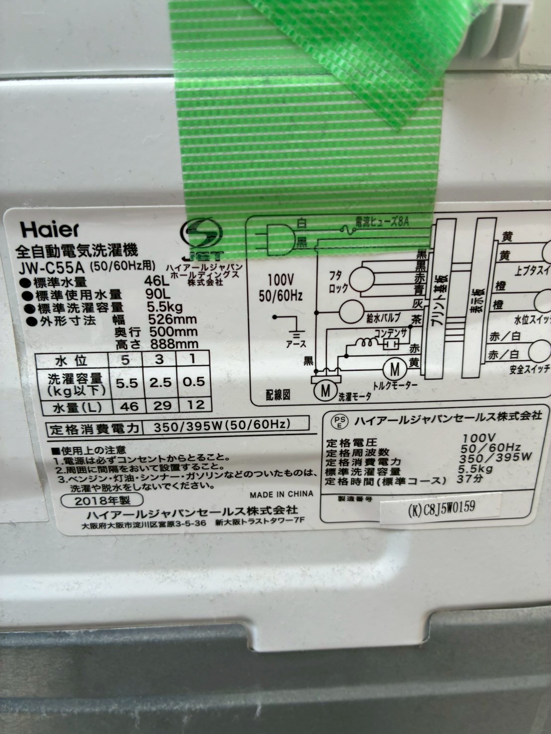 埼玉県川越市にて Haier JW-C55A 全自動洗濯機 5.5kg 2018年製を無料引取りしました