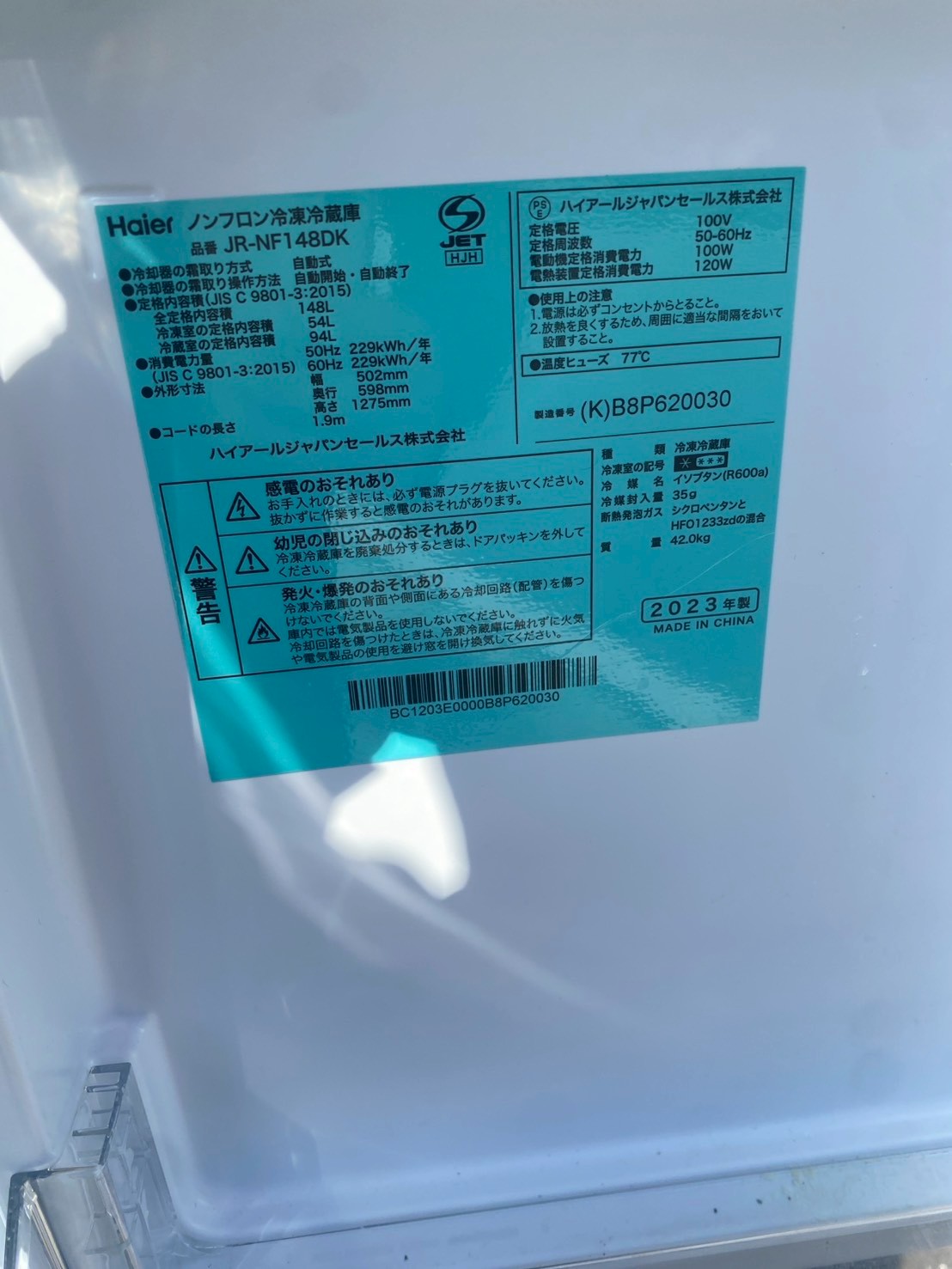 今回は入間市にお住まいの40代男性より、Haier ノンフロン冷凍冷蔵庫 JR-NF148DK(2023年製)を不用品買取にてご依頼いただきました。