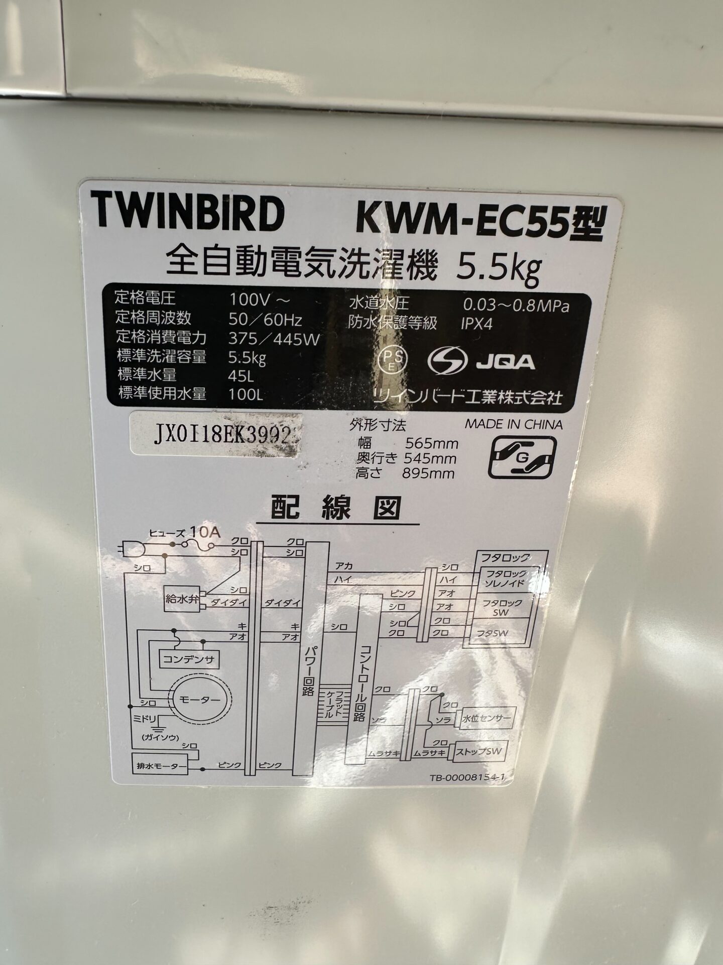 埼玉県上尾市へ不用品買取 ツインバード 全自動洗濯機 KWM-EC55 5.5kg 使用感ありのため適正価格で査定しました
