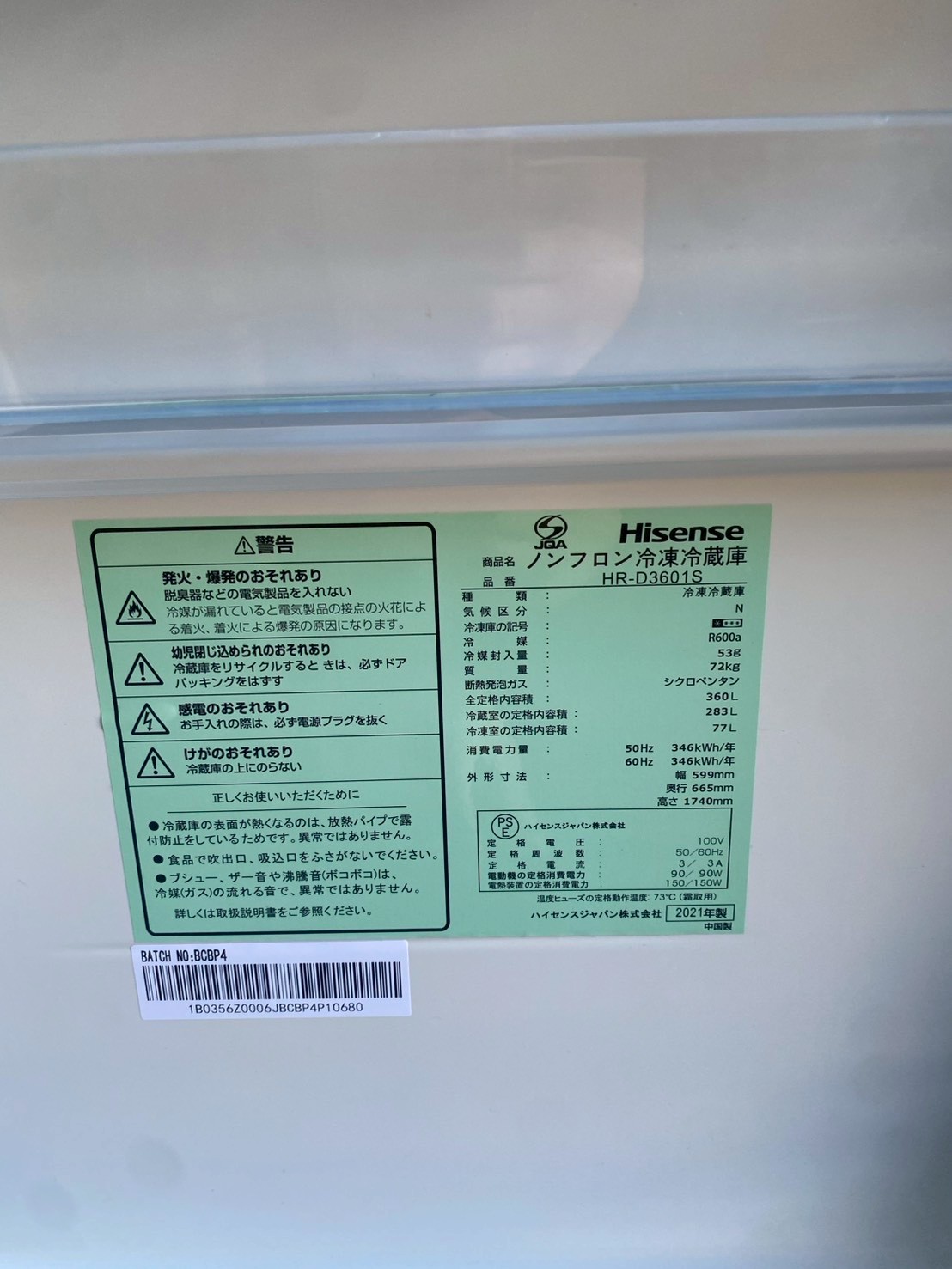 埼玉県入間市でハイセンス 冷凍冷蔵庫 HR-D3601S(2021年製)美品を不用品買取しました