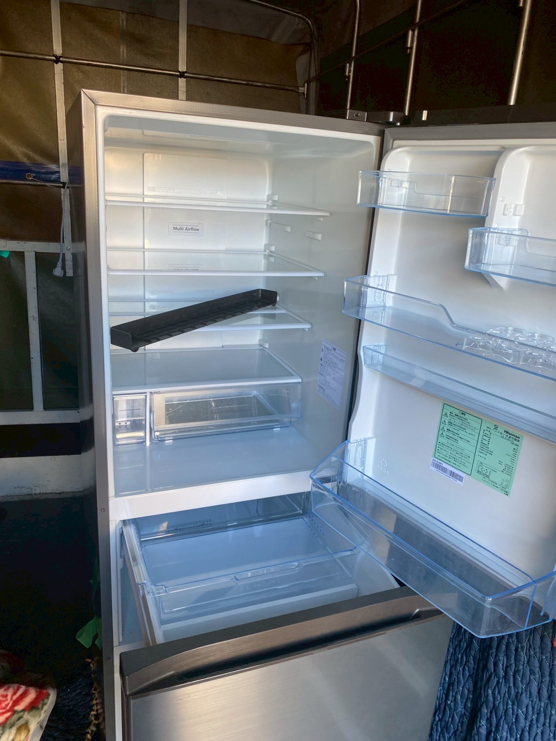 お引き取りした冷蔵庫は外観に大きな傷や凹みが見られない良好な状態でした。ステンレス調の外装もきれいで、使用に伴う軽微な擦れはあるものの、目立つダメージは確認されませんでした。庫内も非常に清潔で、棚板・ドアポケットともに欠品はなく、全体的に使用感の少ないコンディションでした。冷却機能も問題なく、冷蔵・冷凍ともに正常に動作しております。