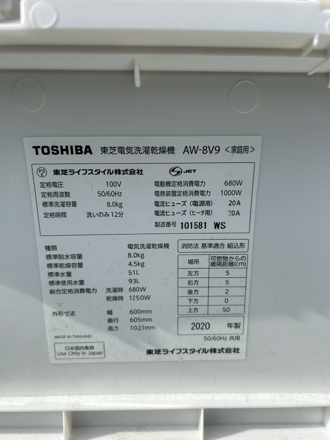 埼玉県朝霞市へ出張買取 TOSHIBA AW-8V9 洗濯乾燥機 2020年製 使用感ありのため無料引取りで対応しました