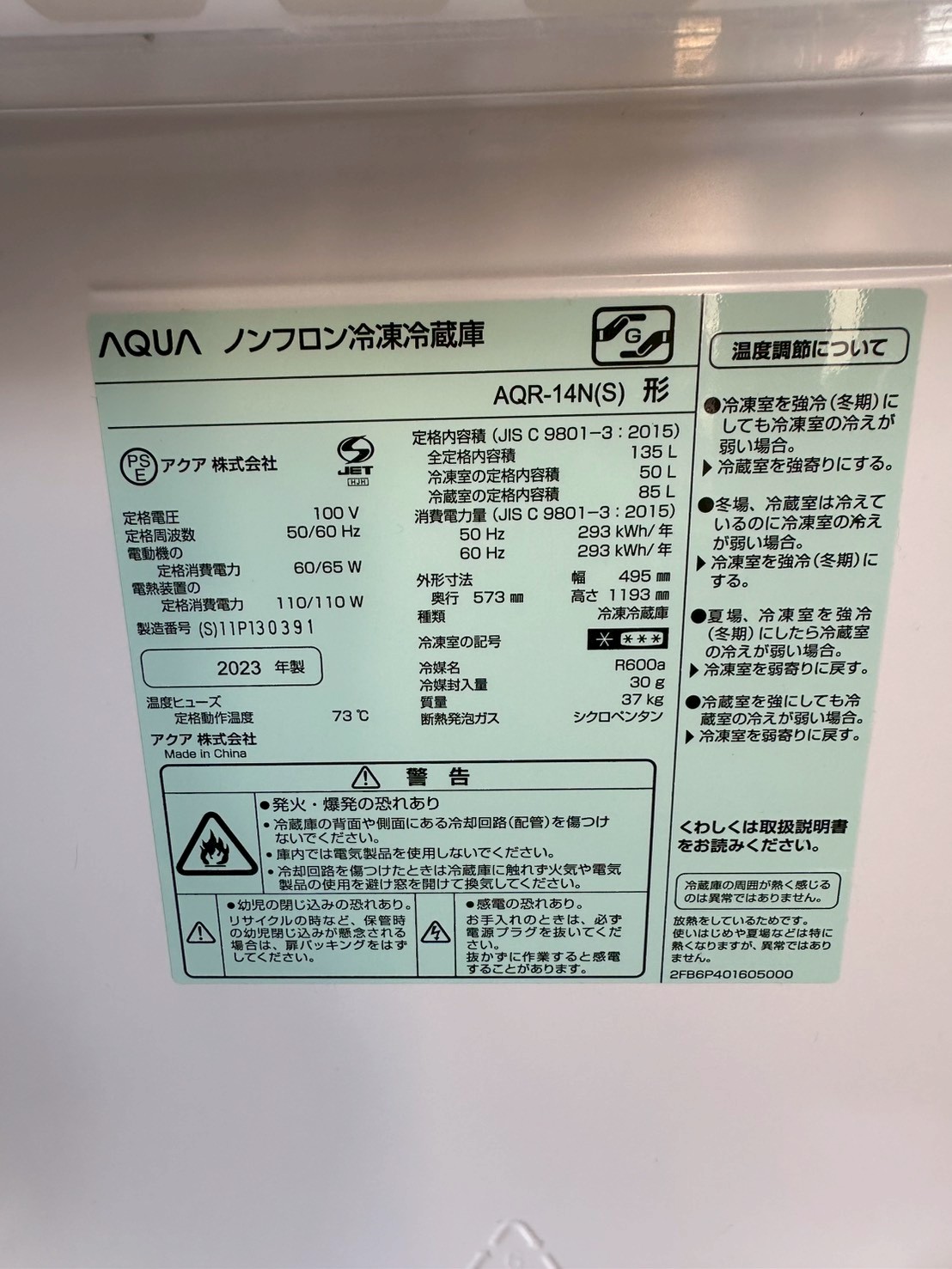 今回は川越市にお住まいの40代男性(会社員・単身・賃貸マンション)より、AQUA ノンフロン冷凍冷蔵庫 AQR-14N(S)(2023年製)を不用品買取にてご依頼いただきました。