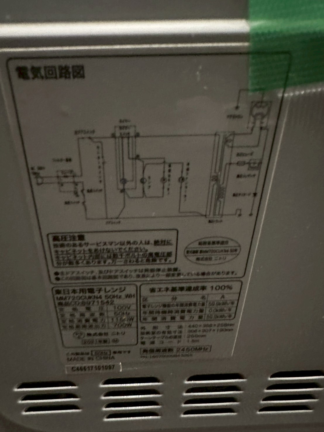 お預かりした電子レンジは外装に細かな擦り傷や使用感が見られる状態でした。庫内にも軽度の汚れが確認できましたが、ターンテーブルや内部パーツは揃っており、加熱動作も問題なく使用できる状態でした。ただし、2015年製と年式が経過しているため、全体的に中古品としての経年劣化は見受けられます。