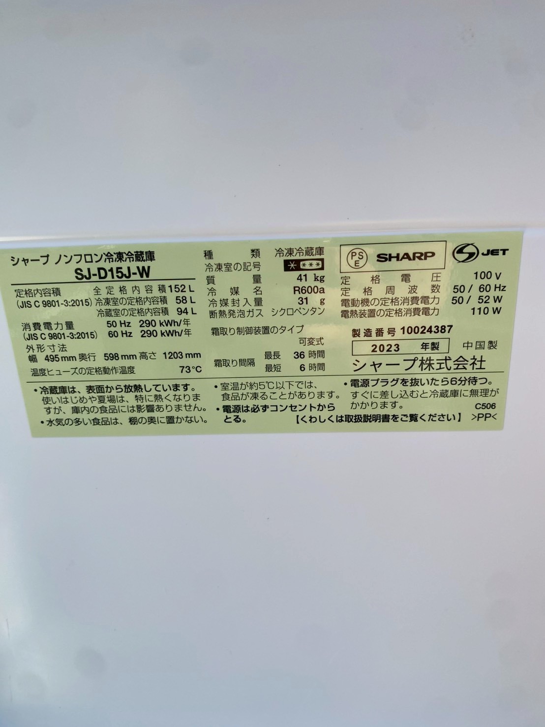 今回は入間市にお住まいの30代男性より、シャープ 2ドア冷蔵庫 SJ-D15J-W(2023年製)を不用品買取にてご依頼いただきました。