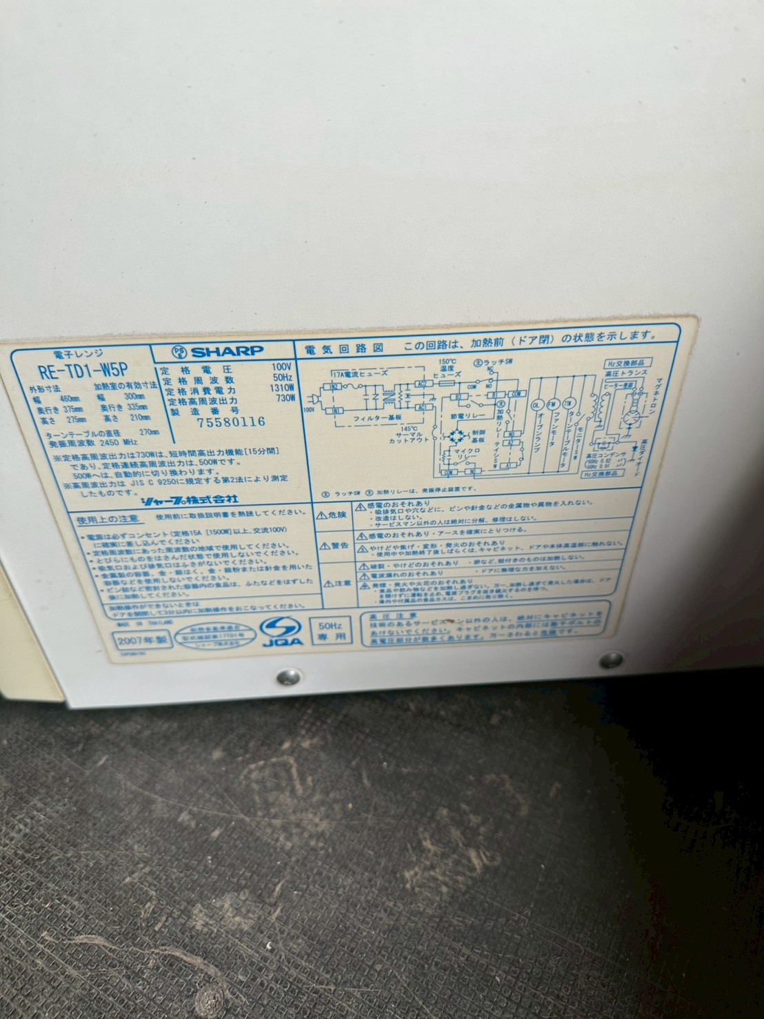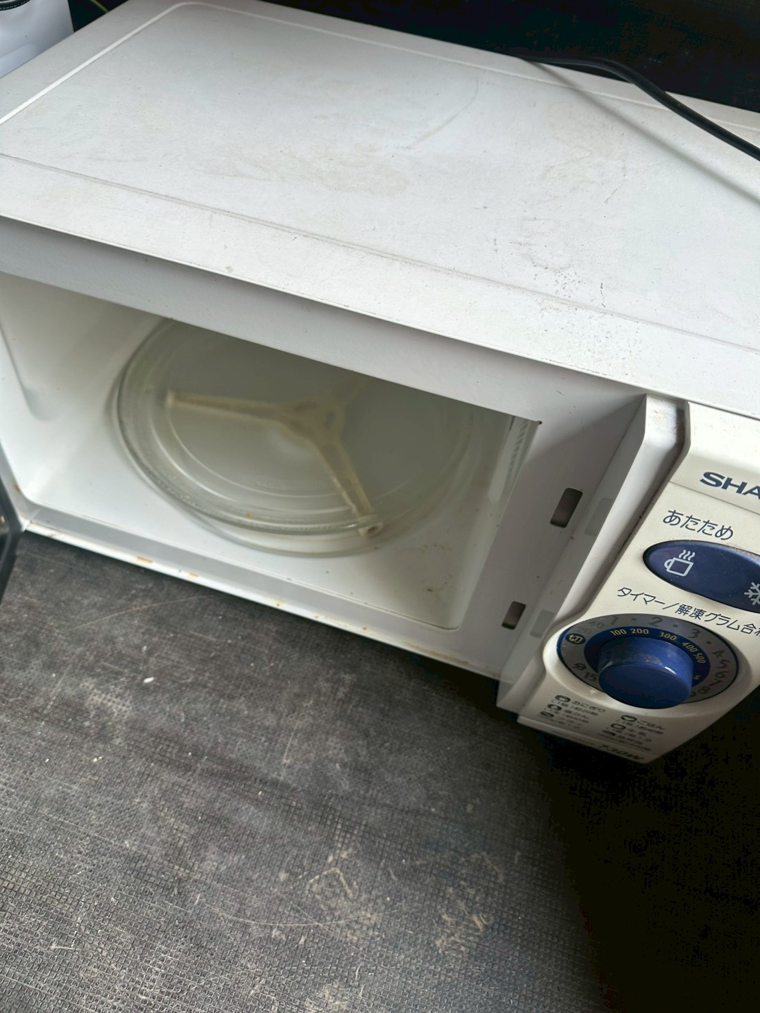 お引き取りした電子レンジは長年使用されていたことによる外装の汚れやくすみが見受けられる状態でした。天面や側面には細かな汚れが付着しており、庫内にも使用に伴う汚れが確認されました。また、付属品はターンテーブルのみで説明書や元箱は欠品していました。年式も2007年と経過しているため、全体的に使用感のある状態でしたが、通電および基本的な加熱動作は確認できました。