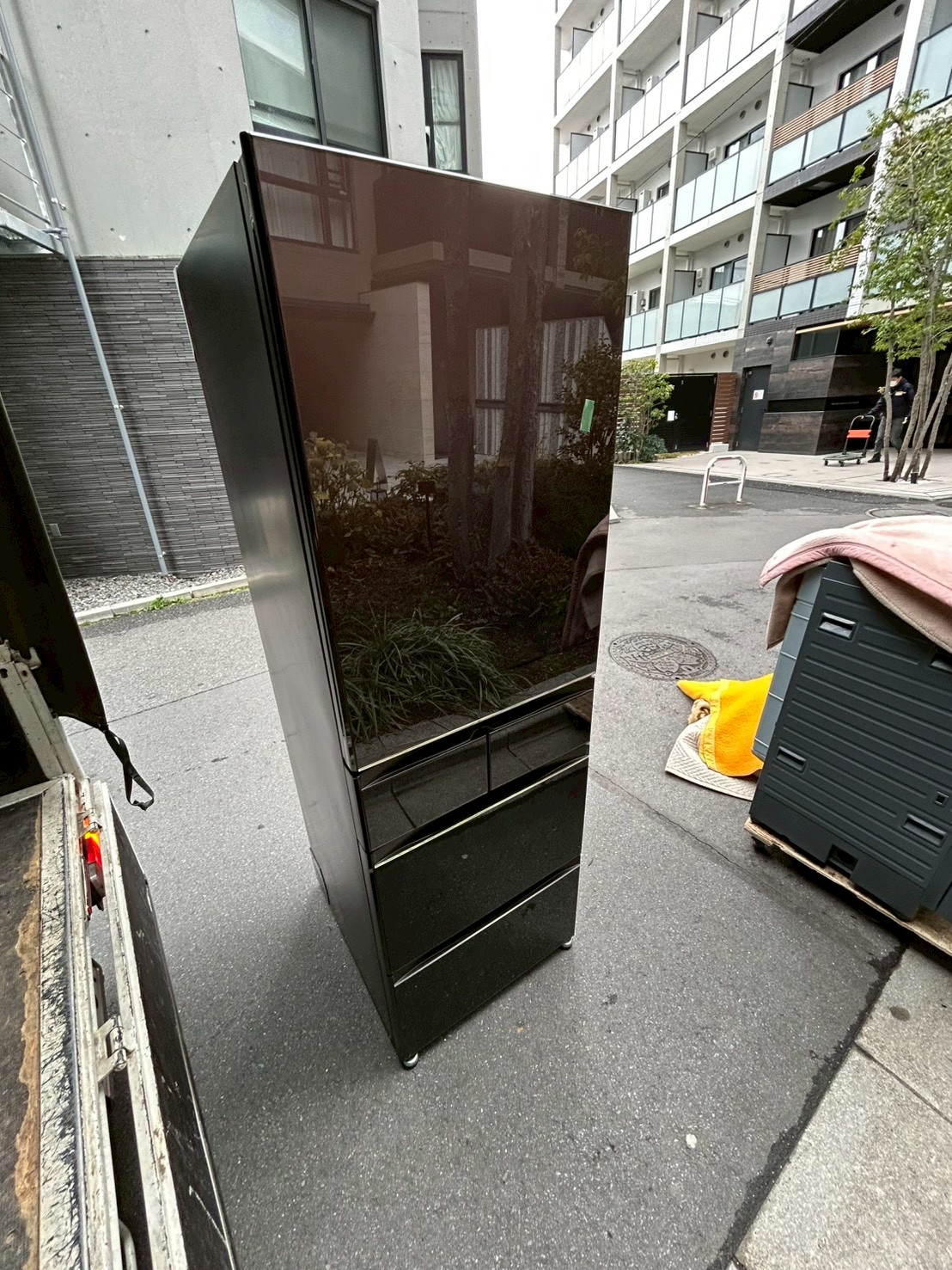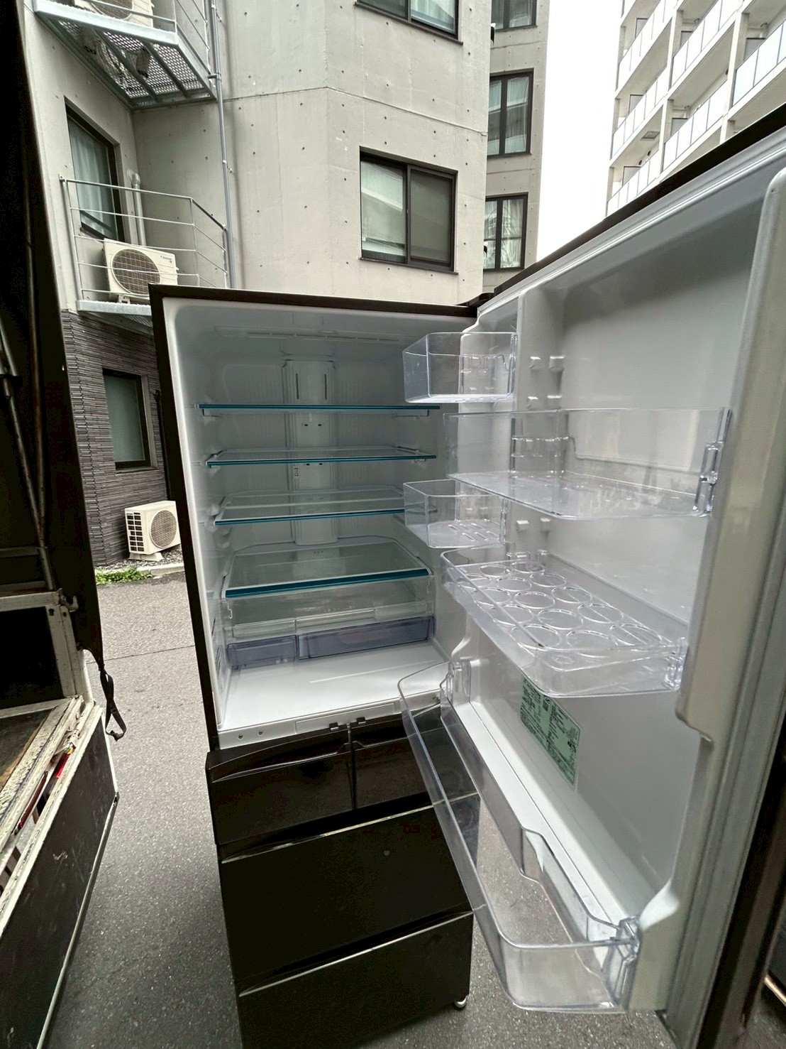 お引き取りした冷蔵庫はガラス調の外観が特徴的な高級モデルで、外装には目立つキズやへこみは見受けられず、全体的に非常にきれいな状態でした。庫内も使用感が少なく、棚やドアポケットも破損なく揃っており、清潔感のある良好なコンディションでした。動作確認も問題なく、冷却性能も安定していることを確認しております。