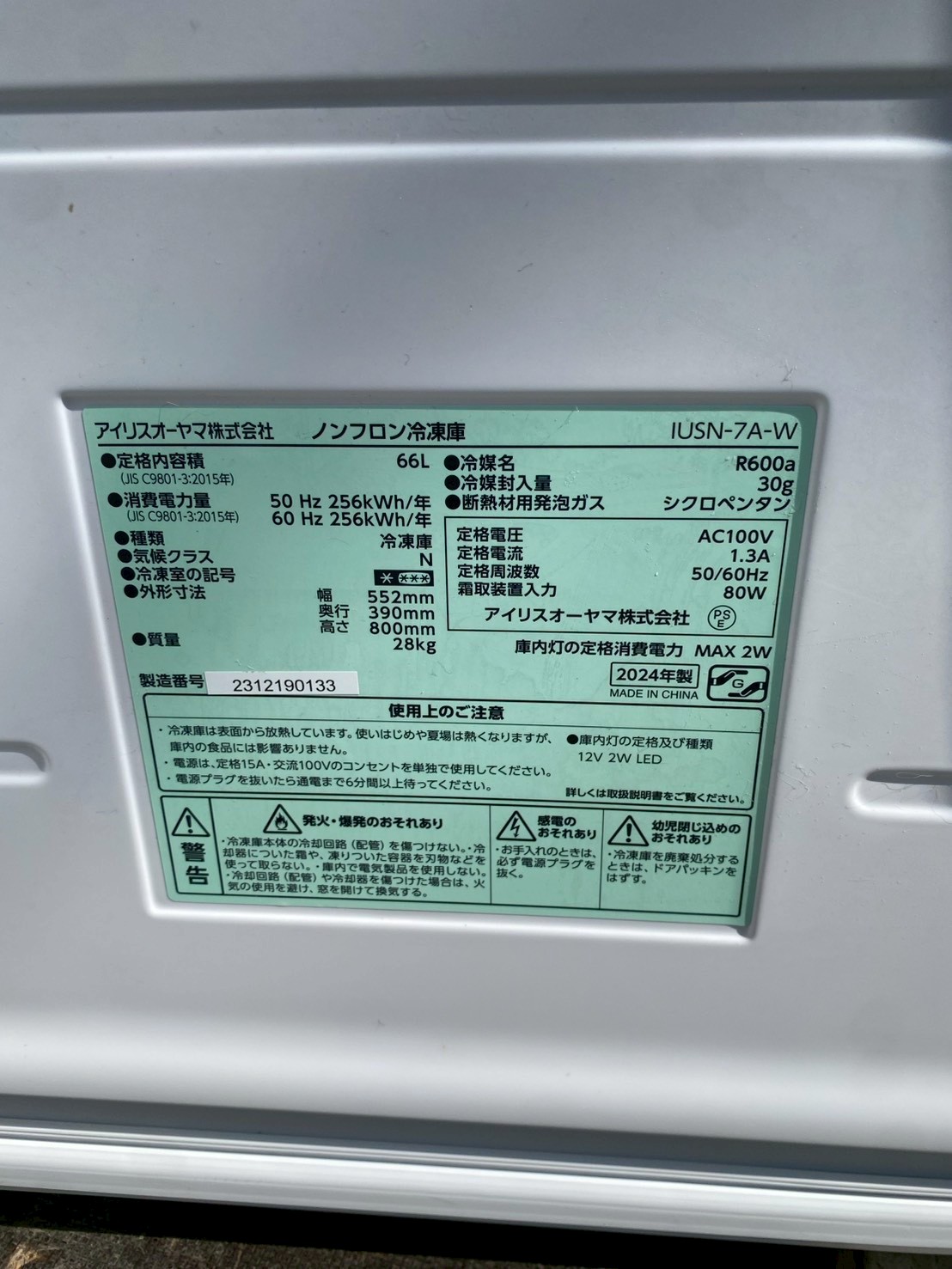 埼玉県さいたま市でアイリスオーヤマ IUSN-7A-W 2024年製 冷凍庫 美品を不用品買取しました